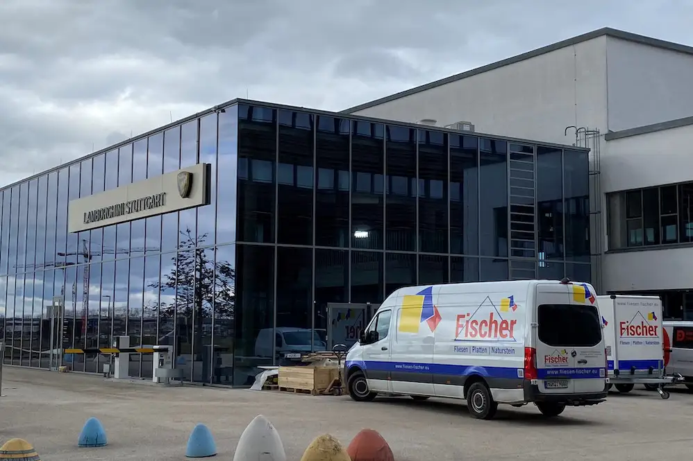 Umfang: ca. 900 m² Bodenfliesen im Showroom, ca. 330 m² Fliesenarbeiten in der Werkstatt